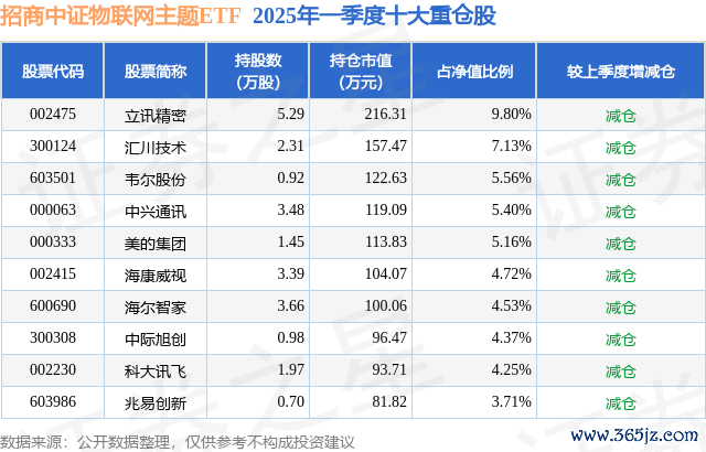 从基金规模来看博宝配资,招商中证物联网主题ETF基金2025年一季度公布的基金规模为0.22亿元,较上一期规模2232.04万元变化了-24.77万元,环比变化了-1.11%。该基金最新一期资产配置为:股票占净值比99.34%,无债券类资产,现金占净值比0.81%。从基金持仓来看,该基金当季前十大股票仓位达54.63%,第一大重仓股为立讯精密(002475),持仓占比为9.8%。